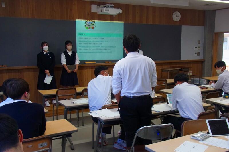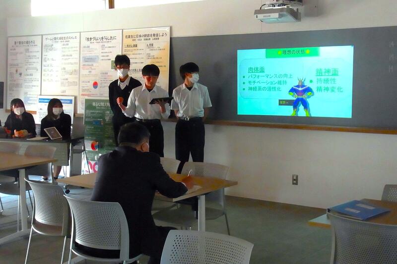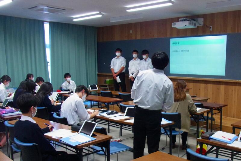 本校では、自然、医療、農業、観光、教育などの各分野について、生徒自らがテーマを設定し、グループごとに地域や社会問題などの課題について、地域の事業所や市役所などの協力を受けながら探究学習に取り組んでいます。