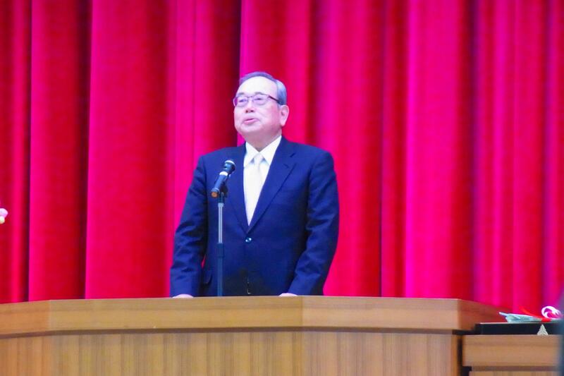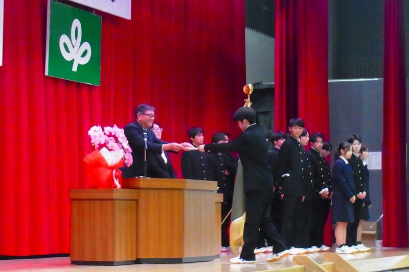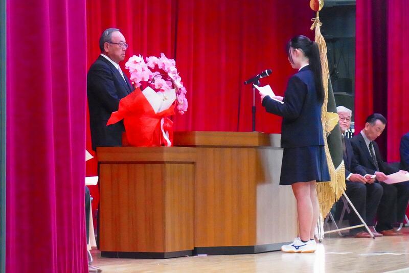 氏家同窓会会長から卒業生へ向けてお話しをいただき、記念品が贈呈されました。そして同窓会入会にあたり各クラスの代表生徒に期別幹事の委嘱があり、卒業生は同窓会員として、母校の活躍を支えていきたいという決意が述べられました。