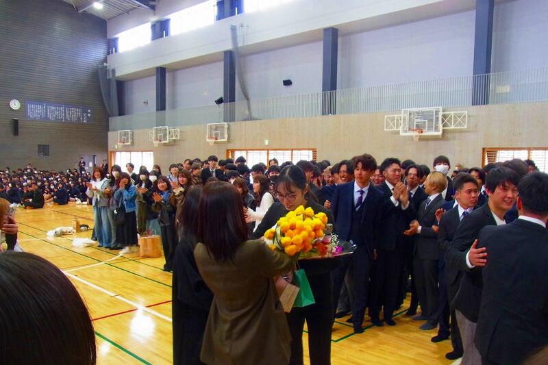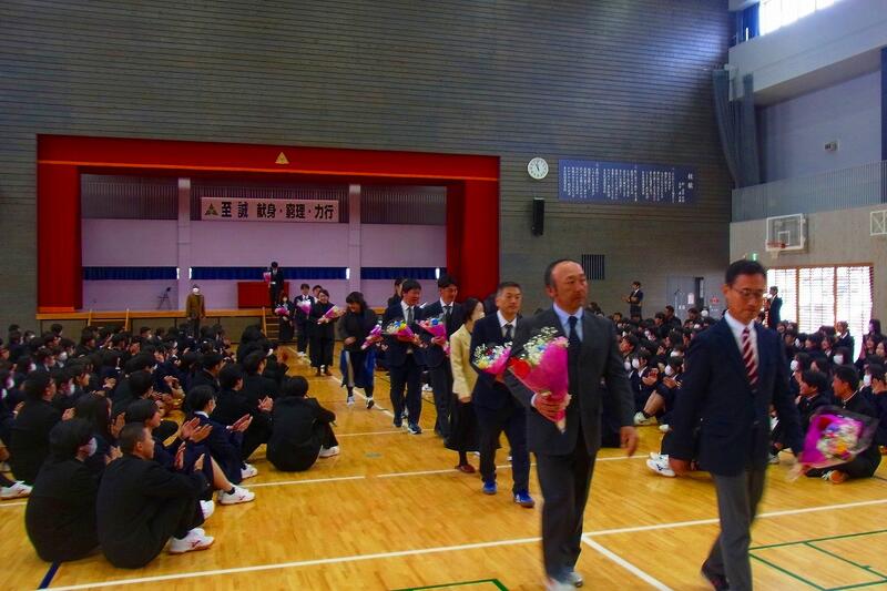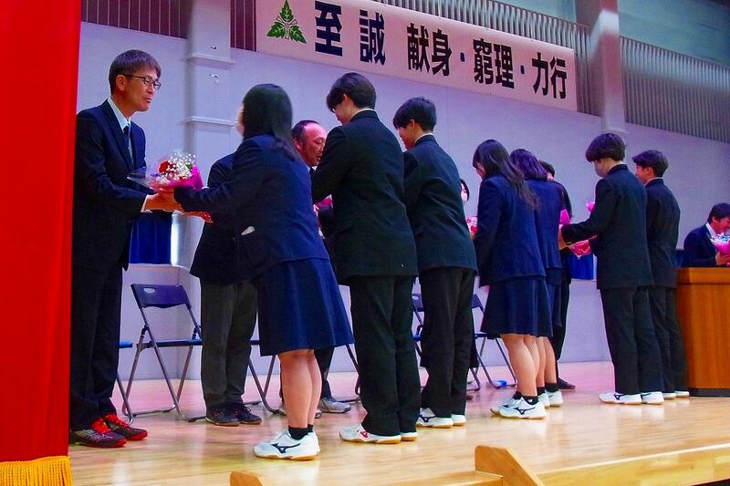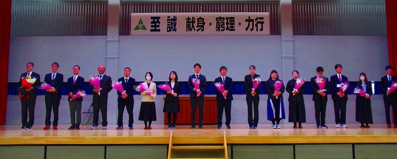 在校生を代表して生徒会長の五十嵐龍誠さんから離任される教職員の方々へ感謝の言葉を述べたあと、代表生徒から一人一人に花束が贈られました。