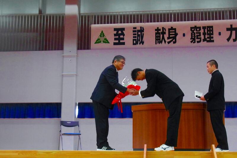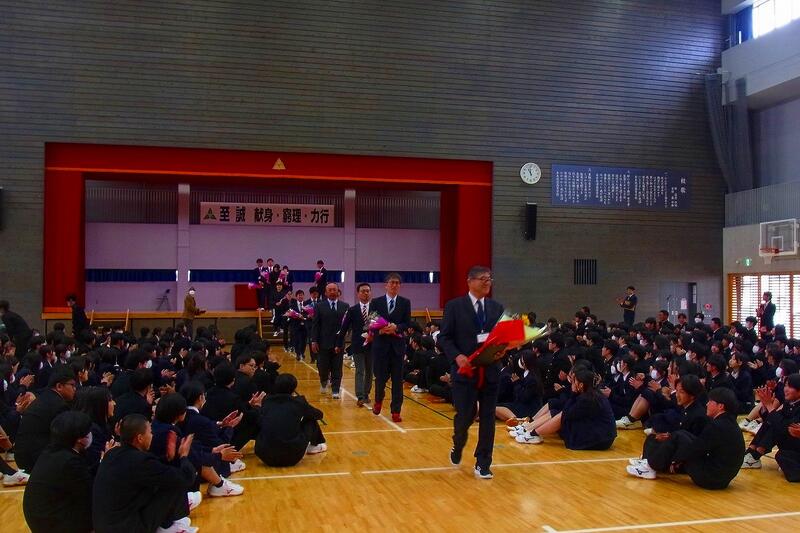 続いて、今年度でご退任される加賀谷校長先生の退任式が行われ、加賀谷校長先生から退任のご挨拶をいただき、生徒会長の五十嵐龍誠さんが感謝の言葉を述べたあと、代表生徒から校長先生に花束が贈られました。