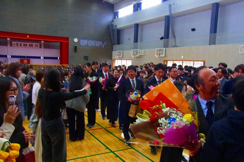 離任式が終わり、加賀谷校長先生はじめ、退職・転任される教職員の方々が、吹奏楽部の演奏が流れる中、生徒や大勢の卒業生たちの見送りを受け、両手いっぱいに花束を抱え、別れを惜しみながら退場されました。