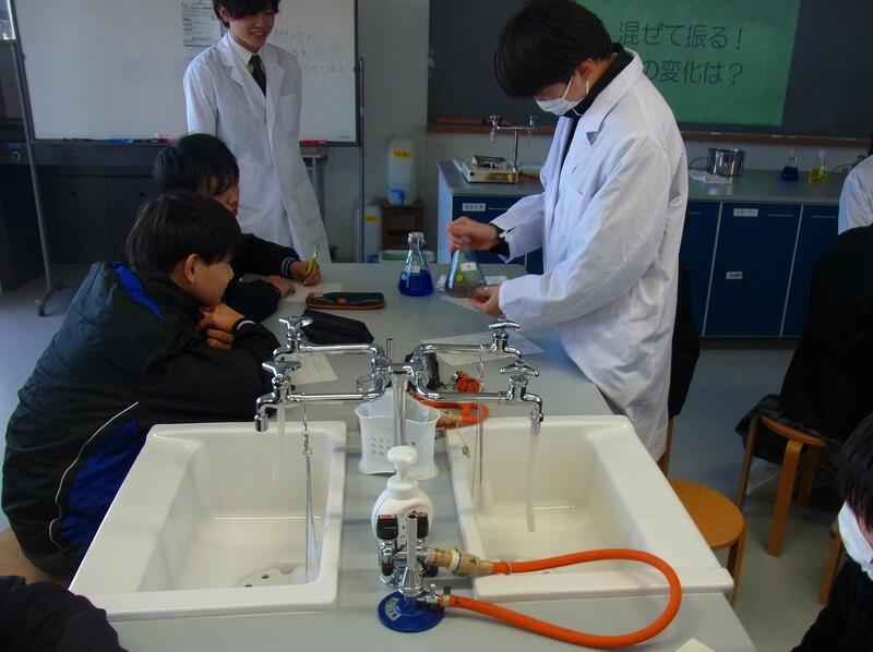 1年生の生徒(豊里小・中学校卒業生)が後輩たちに学校生活や部活動などの紹介をしました。その後、新校舎をまわって、授業の様子や開放的な図書室などを見学してもらいました。また、並行して化学や地理の模擬授業を体験してもらいました。